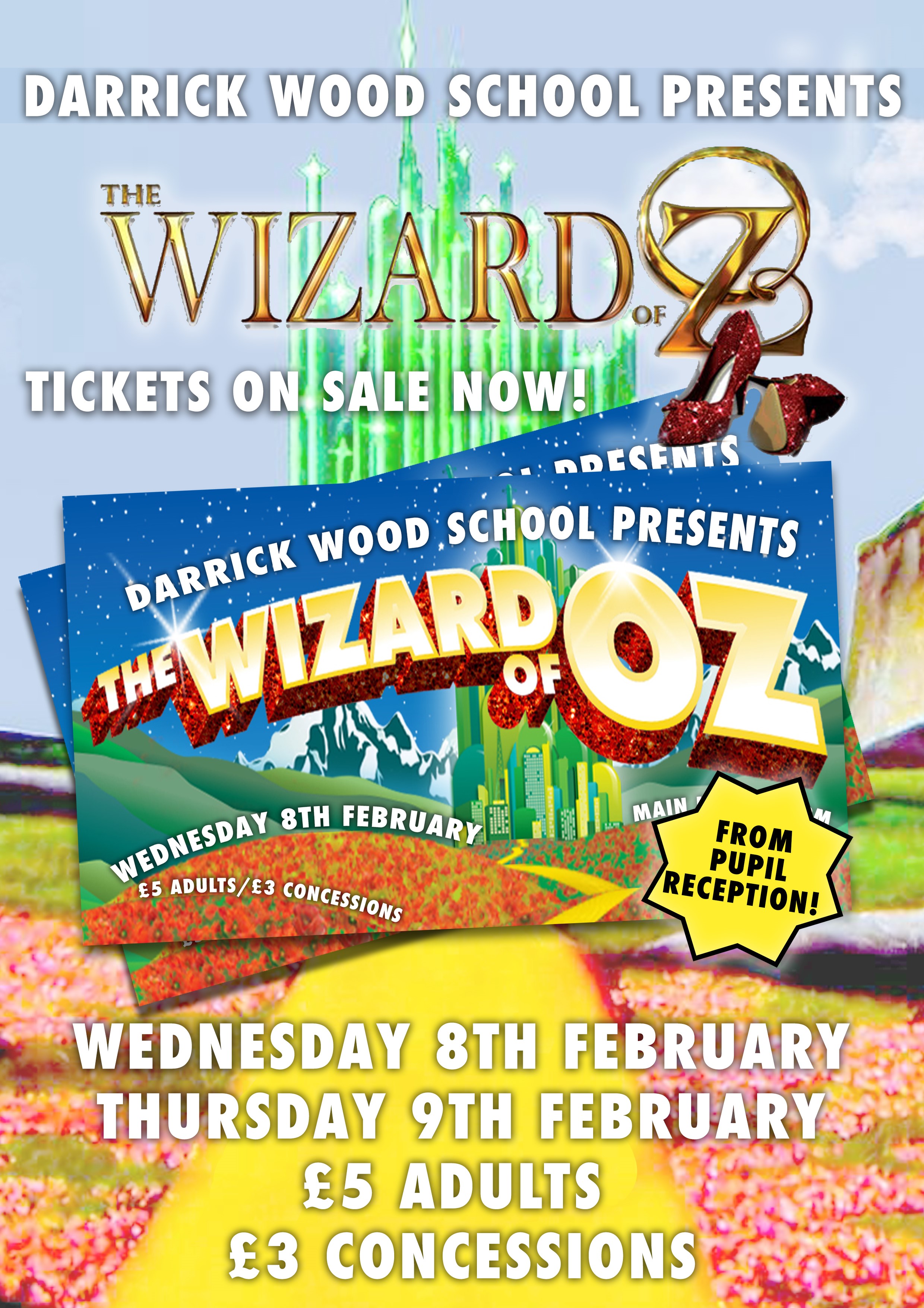 Tickets for this year’s production of “The Wizard of Oz” are on sale from today. They cost £5 for adults and £3 for concessions and can be purchased from pupil reception (before school and at lunch time). The performance will take place on Wednesday 8th and Thursday 9th February at 7.30pm in the Main Hall. We look forward to welcoming you to what will be an outstanding production.