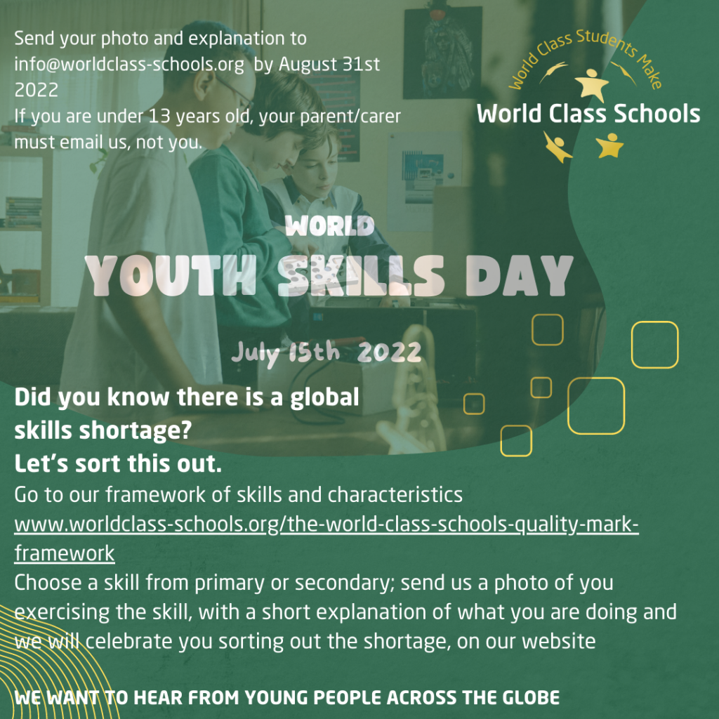 To celebrate World Youth Skills Day we are asking World Class students to send us a photo and an explanation of one World Class characteristic they have demonstrated over the summer, which we will feature on our website. Details below:
