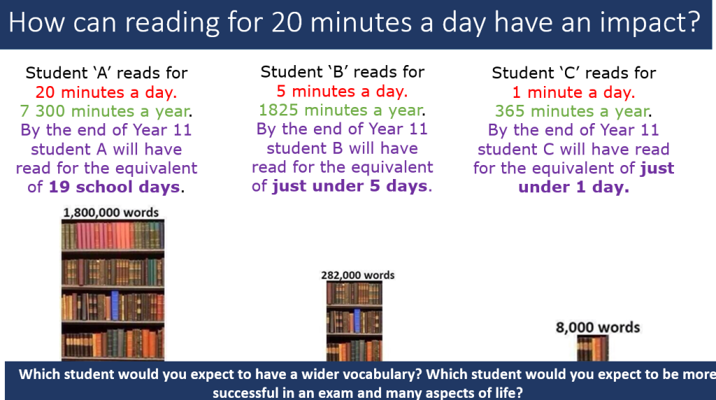 - That there is a link between students that read for pleasure, even for just a few minutes a day, and the impact this has on vocabulary development. There is also an associated link with success in public examinations.