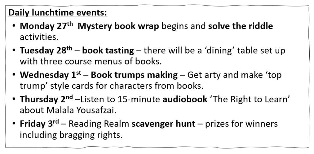This year parents/carers will be aware we opened the Reading Realm in our former library space. This is incredibly popular with students, especially at break and lunchtime. Throughout this week in the Reading Realm and more generally around school there have been World Book Day activities for students to take part in. All of Year 7, for example, on Monday listened to instalments of a story at the start of each lesson. Every time they moved lessons they heard the next part of the story. We hoped they enjoyed this. Other activities at lunchtime included: