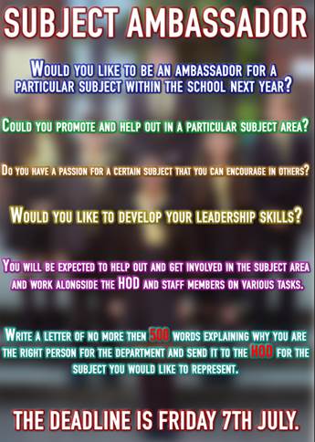 As part of our plans to enhance our personal development curriculum we have been advertising to students the role of subject ambassador. This has been offered to students in Years 7-10 in all subject areas. Those chosen for the position will be informed by the end of term.