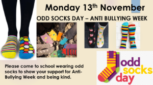 To launch Anti-Bullying Week, we are encouraging all students and staff to wear odd socks on Monday, 13th November. See below: