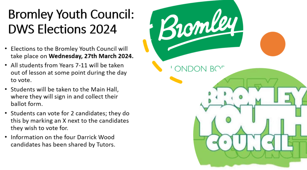 Please find attached information about the Bromley Youth Council elections taking place at Darrick Wood on Wednesday, 27th March. All students will be taken to the Main Hall during this day and given the chance to vote. Please run through the attached presentation in order to discuss both the candidates and the procedures of the day to your form group.