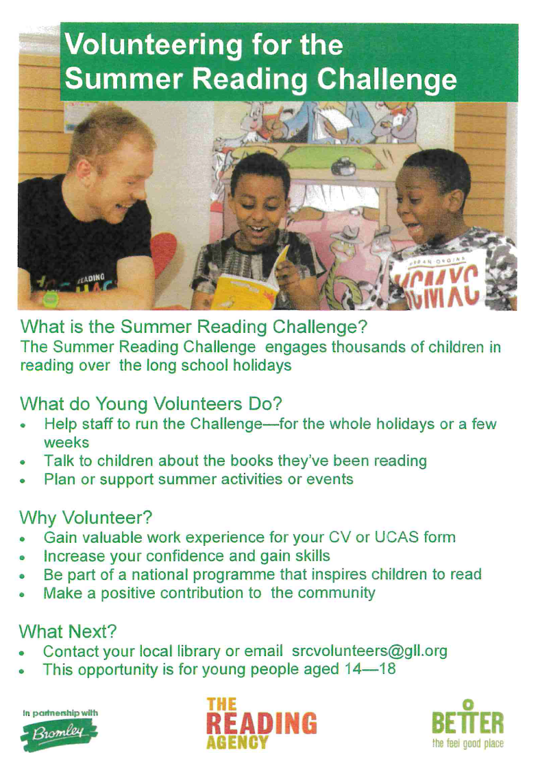 Bromley Libraries are offering young people aged 14-18 the chance to volunteer to help children take part in the Summer Reading Challenge 2019. Anyone interested should contact their local library or email srcvolunteers@gll.org